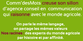 Les acteurs du monde agricole nous le rendent bien et certains nous font confiance depuis longtemps: Le réseau CAMPA / SUMIAGRO France / FAUCHEUX / SCHERING PLOUGH VETERINAIRE et autres: UBIFRANCE, FARRE, France Export Céréales. Personne ne nous impose des quotas d'annonceurs ! Nous avons de la ressource et des ressources pour répondre à toutes vos problématiques de communication et faire germer vos idées ! L'équipe Comm'desMots vous attend: consultez-nous, interrogez-nous... Nous sommes prêts et disposés à vous écouter, à vous conseiller et à prendre en charge toutes opérations de communication. Où que vous soyez en France, l'équipe se déplace et vient vous présenter Comm'desMots et ses réalisations quand vous voulez.